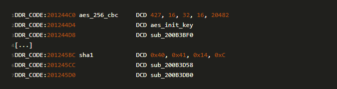 其他功能,例如 EVP_aes_256_cbc 和 EVP_sha1 ,可以通过使用交叉引用到 NID 定义来识别算法,例如 #defineNID_aes_256_cbc427 和 #defineNID_sha164 :