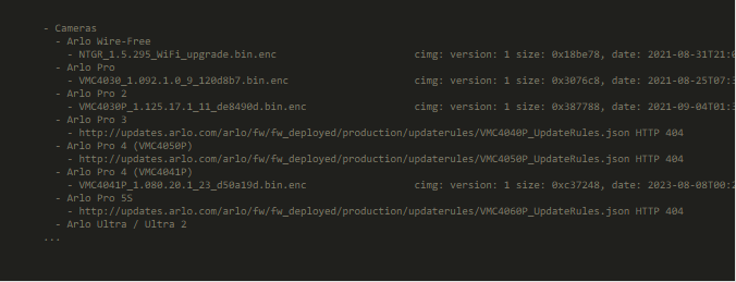 //updates.arlo.com/arlo/fw/fw_deployed/production/updaterules/VMC4041P_UpdateRules.json ( VMC4041P 是 Arlo Pro4 的模型 ID)。这个 JSON 文档包含了二进制路径、版本和日期,以及二进制的 MD5 哈希值。