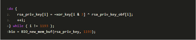 AES 密钥使用嵌入在加载文件中的 RSA 私钥进行解密。RSA 私钥使用加载文件中的 4 字节 XOR 密钥进行加密。