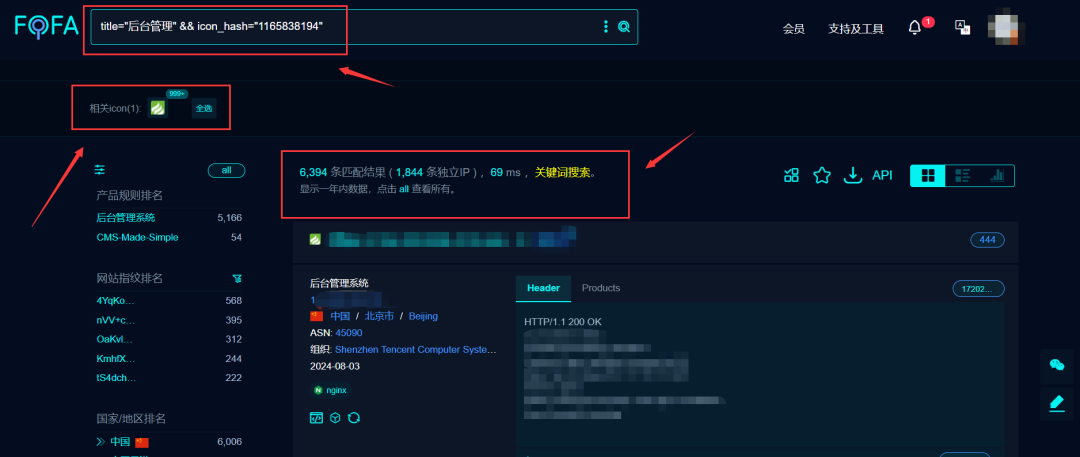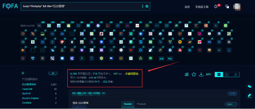可以看到这样检索匹配出来的资产也都蛮多的,而且匹配出来的都是thinkphp 的站点