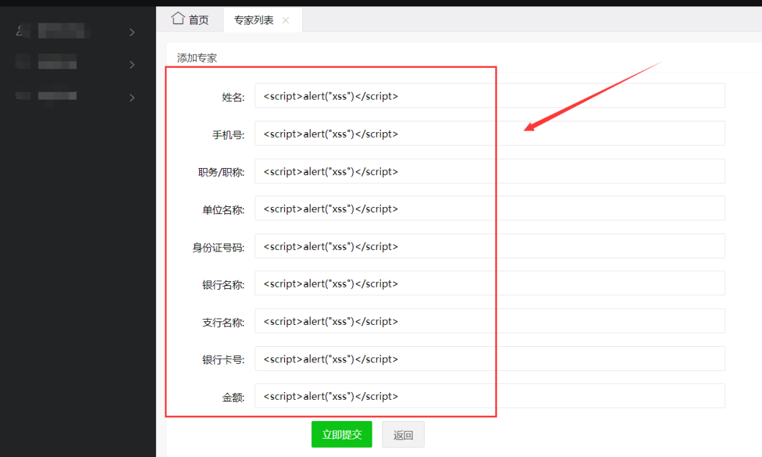 然后在下面的输入框中都输入简单的XSS弹窗语句
