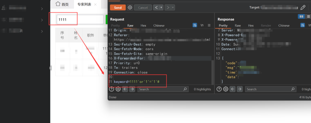 下面看到该站点存在查询接口,一般看到这样的,很常见的手法就是测一个sql注入,先尝试一个手工注入吧,在bp里面测试