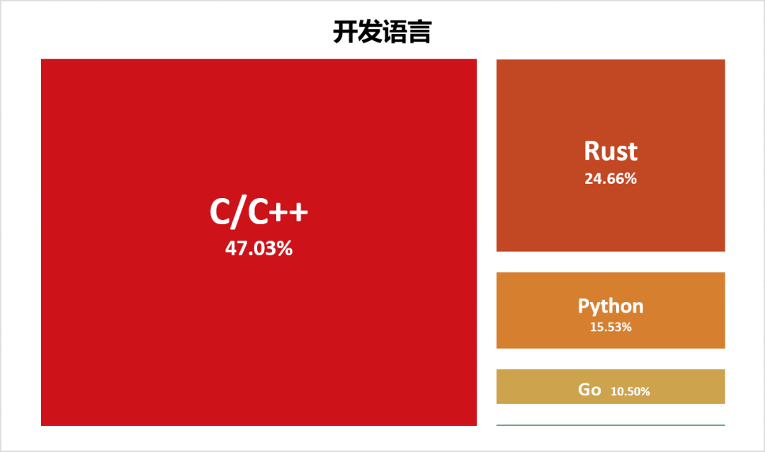 从今年来看,大部分木马仍由 C/C++编写。其中,Rust语言编写的木马因其逆向分析难度大和免杀效果更佳等特点,在今年得到了广泛的应用,成为红队新宠,一举跃升至第二的位置。