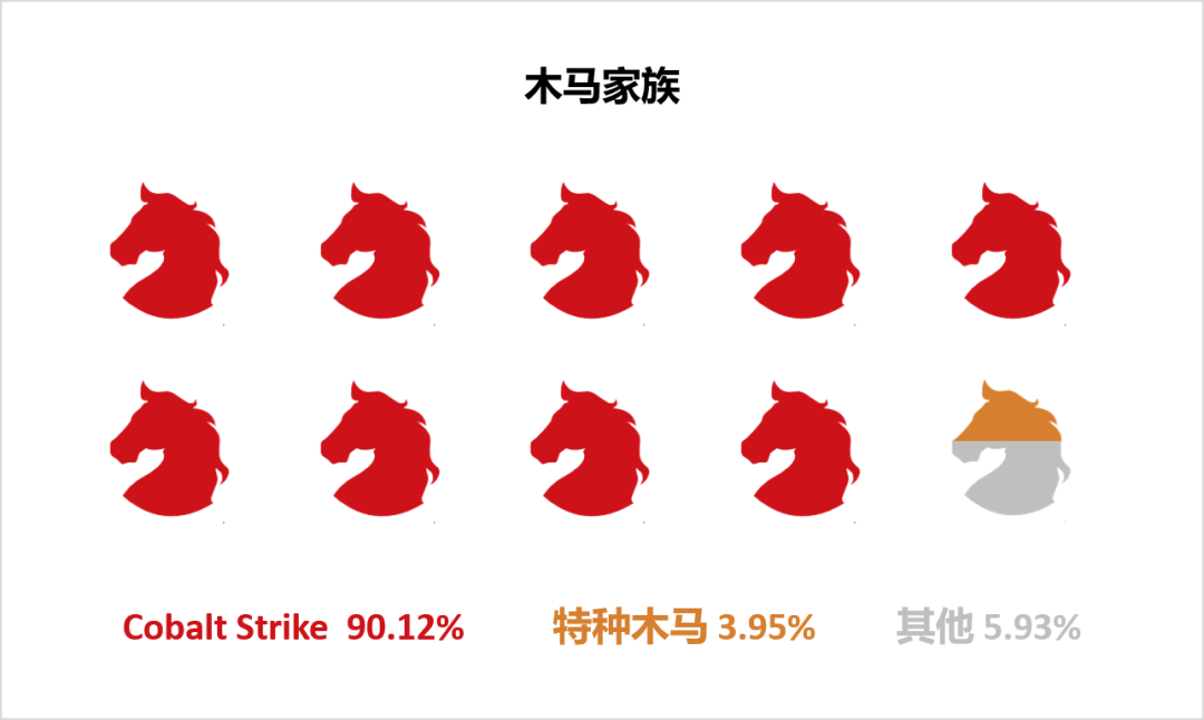 在微步捕获的所有木马样本中,Cobalt Strike依旧是红队最喜爱的工具,占比达90%以上。另外,还有约4%的样本为特种马,属特定红队自有工具,其特征更为隐蔽。