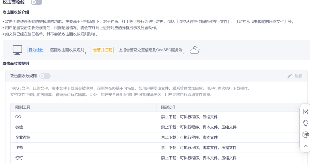 当用户收到文件时,OneSEC能够识别文件格式类型,并根据规则进行拦截。在重保期间,这可以有效防范红队针对文件图标、扩展名的伪装钓鱼。建议用户根据实际业务需求,对压缩文件、可执行文件、脚本文件等高危文件类型设置拦截策略。