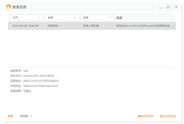 近期,Microsoft宣布了存在于Windows的TCP/IP栈中的Windows TCP/IP远程代码执行漏洞(CVE-2024-38063)。无需用户操作,攻击者即可通过此漏洞远程控制系统。目前,火绒个人版5.0产品最新版本5.0.75.11已支持防护,个人版6.0、企业版产品也会在近期陆续支持防护。请火绒用户及时更新至最新版本。鉴于漏洞存在被利用的可能性,开启相关防护的同时建议使用漏洞修复功能及时更新相关补丁。