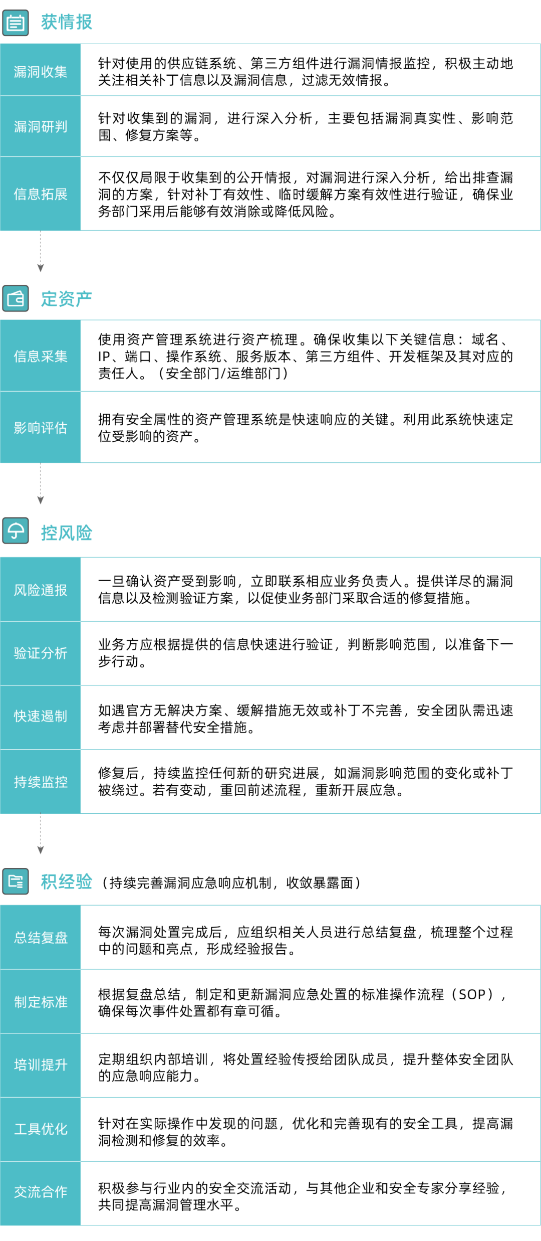 面对更加复杂多样的漏洞情况,一个精细化的漏洞应急响应机制,不可或缺。长亭结合自身的漏洞防护研究和客户场景中的多个最佳实践,提炼出了一套标准化的动作,从基本框架、细节要点到流程化步骤——希望为用户提供一个实施有效、分工明确,且可落地的详尽参考。