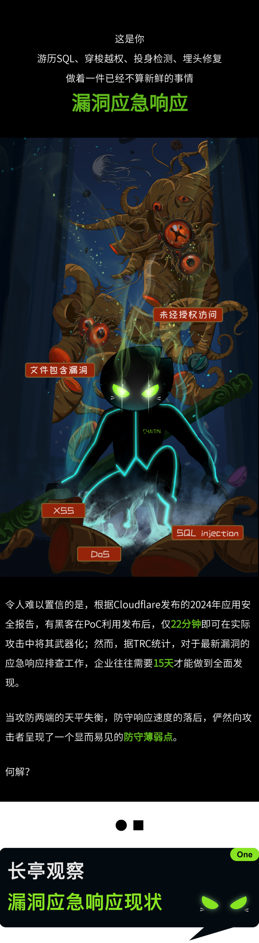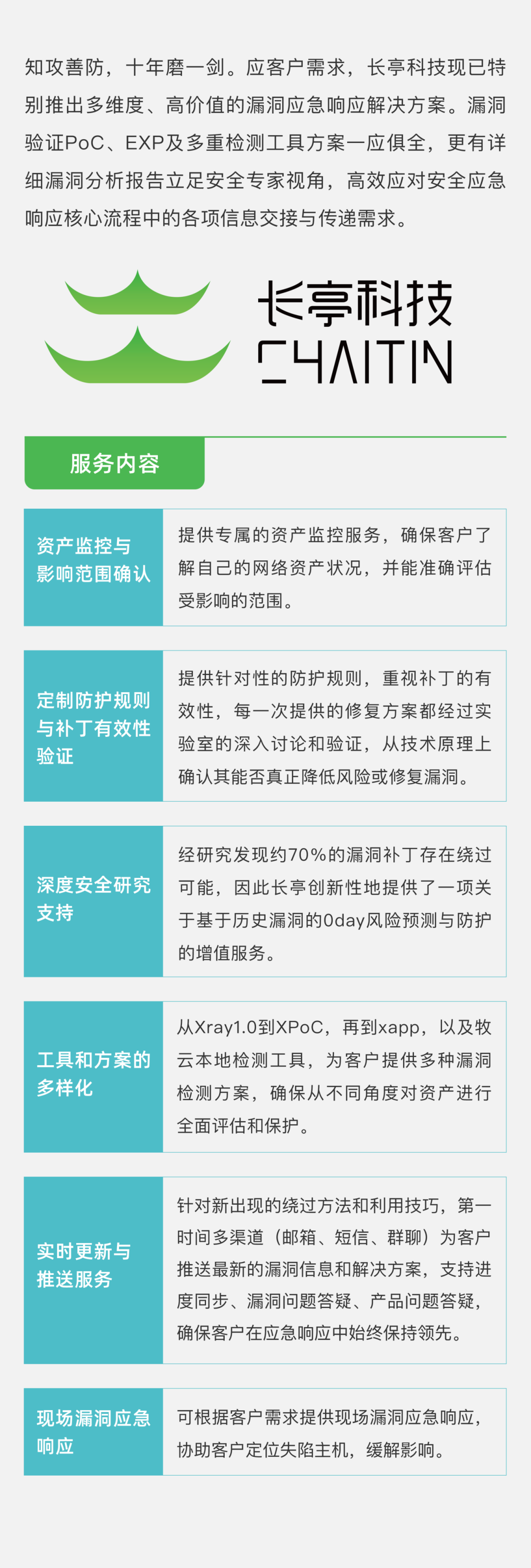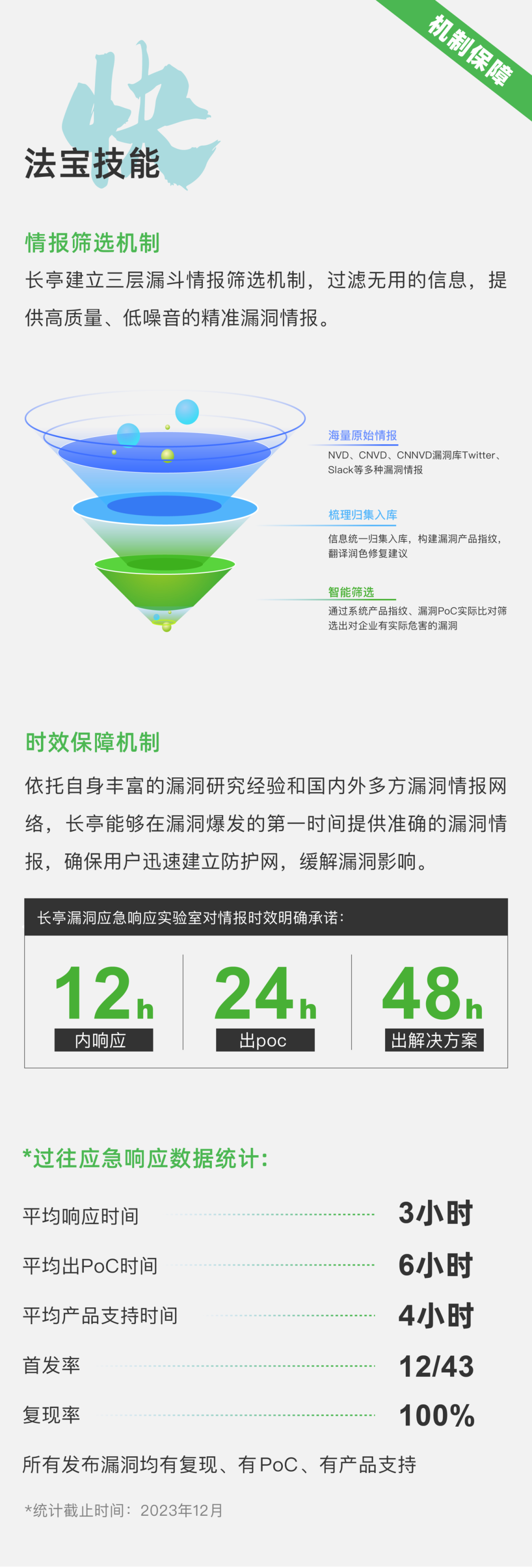 在情报生成过程中,分析与研判则更为关键,且富有挑战性。长亭科技立足市面上漏洞情报通常存在的问题痛点,专注“快、准、狠”的漏洞应急响应之道,匠心打造