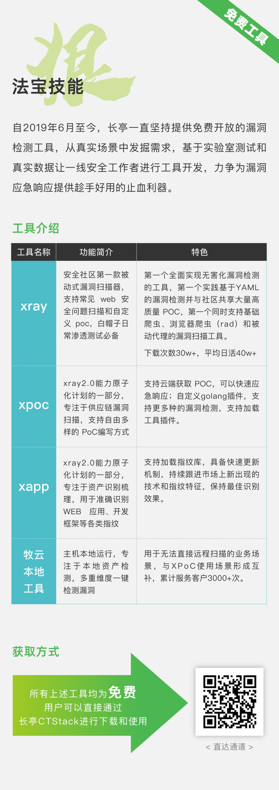 点击上图,前往长亭科技姊妹公众号“长亭安全观察”,阅读长亭漏洞库实战案例、参与活动,你将有机会获得长亭集体智慧结晶《攻防视角 安全运营一本在手》!