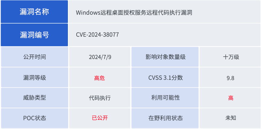 高危漏洞预警|Windows远程桌面授权服务远程代码执行漏洞(CVE-2024-38077)