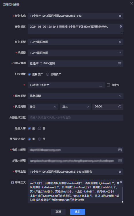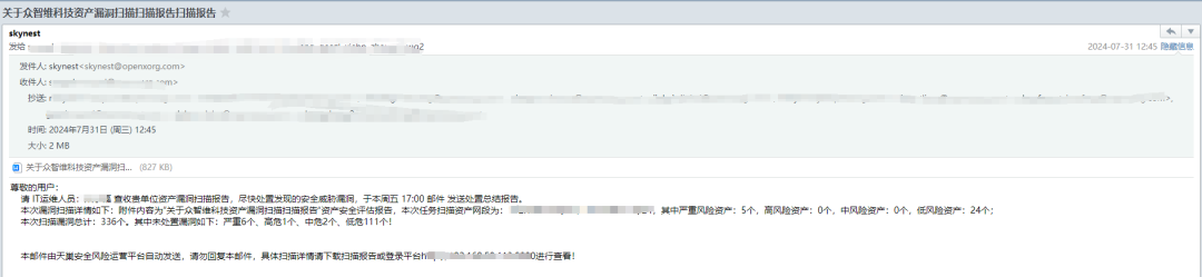 天巢SkyNest安全风险运营平台资产探测+1day漏洞检测模块快速定位受影响范围,获取针对结果及时通报相关部门。通过