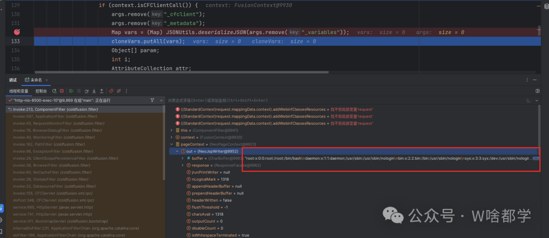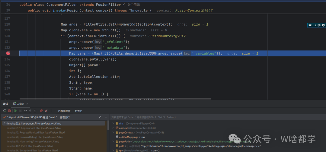 我们从上面的调试分析可以看出来这个漏洞的主要点就是这个ComponentFilter过滤器执行了Map vars = (Map)JSONUtils.deserializeJSON(args.remove(“_variables”));这个args.remove(“_variables”)就是我们传入的路径