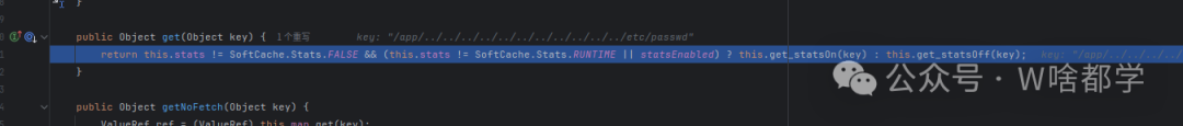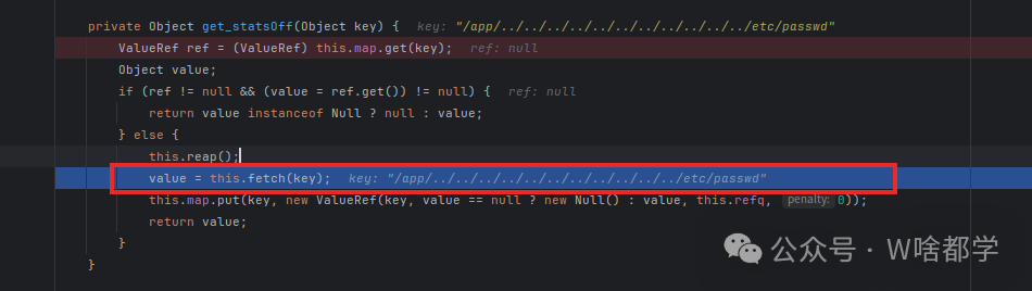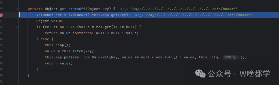 然后进入get_statsOff方法里面,可以看见下面有一个判断如果第一次加载了有这个缓存,如果有就返回这个缓存,如果没有他会重新获取加载,就是说如果你比如第一个执行了/etc/passwd读取这个文件内容了,当下一次执行的时候这个里面就有缓存了,if判断会变成真返回这个缓存
