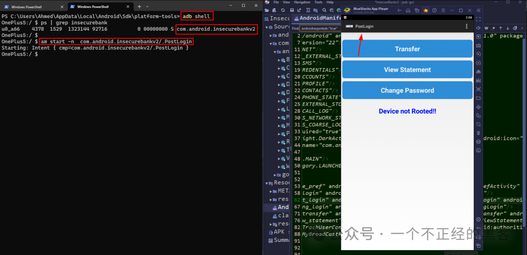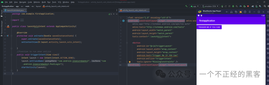 最后一种与现实生活场景相关的方法是实际开发一个Android应用程序,触发一个Intent,以启动InsecureBankv2应用的exported activity。
