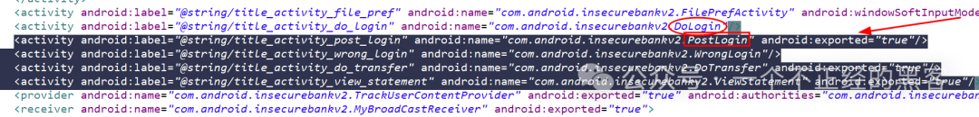 在安装应用并使用jadx进行反编译(当然你可以使用其他工具),通过搜索 exported关键字,我发现该应用程序有三个Activity被导出,其中一个叫做PostLogin。