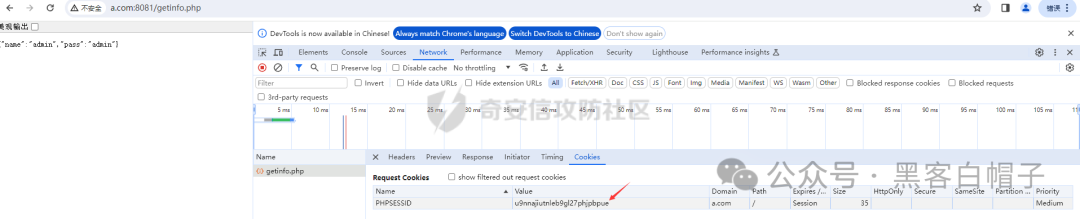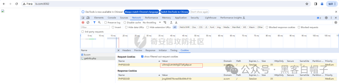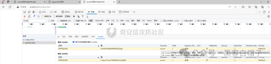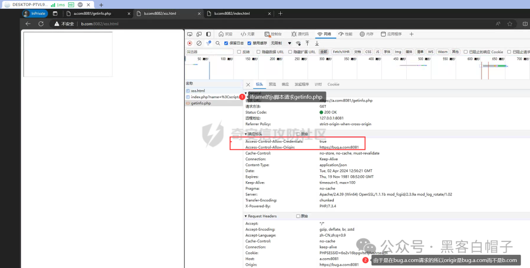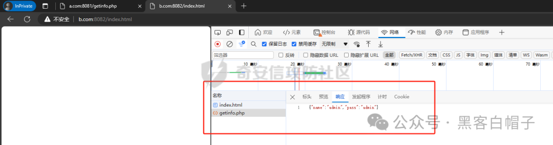 可以看到b.com成功跨域访问了getinfo接口并且携带了cookie。