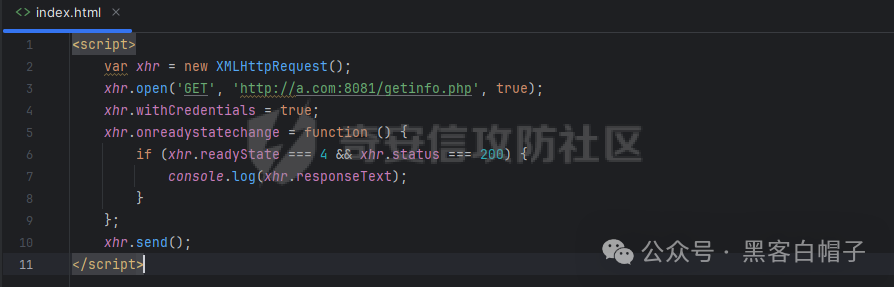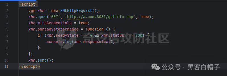 那么假设我们在a网站登录成功的状态下,这时候访问getinfo接口的时候返回了身份信息。那么这时候又去访问b网站。b网站是一个恶意网站,b网站的js会发送一个请求,请求的是a网站的getinfo接口。b网站的代码如下: