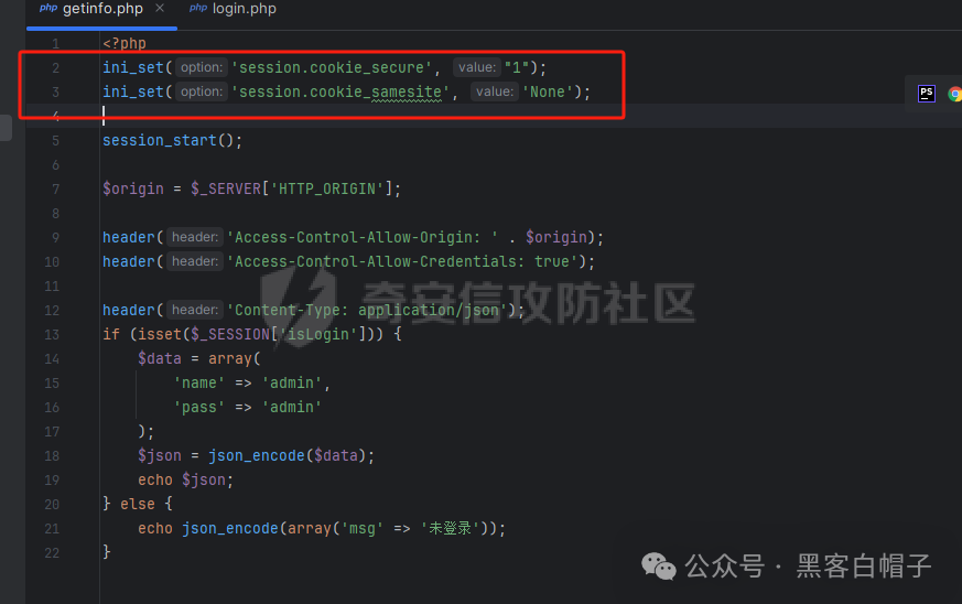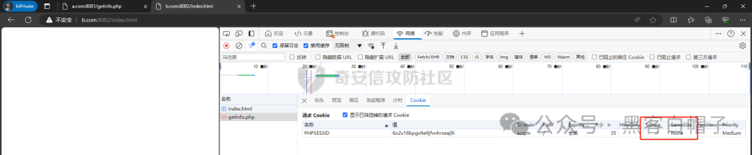 可以看见SameStie严格程度:Strict > Lax > None那么想使得b.com跨域获取getinfo接口的信息,那么getinfo接口还得配置一下cookie。而且要把a.com换成https协议,否则Secure属性不生效。
