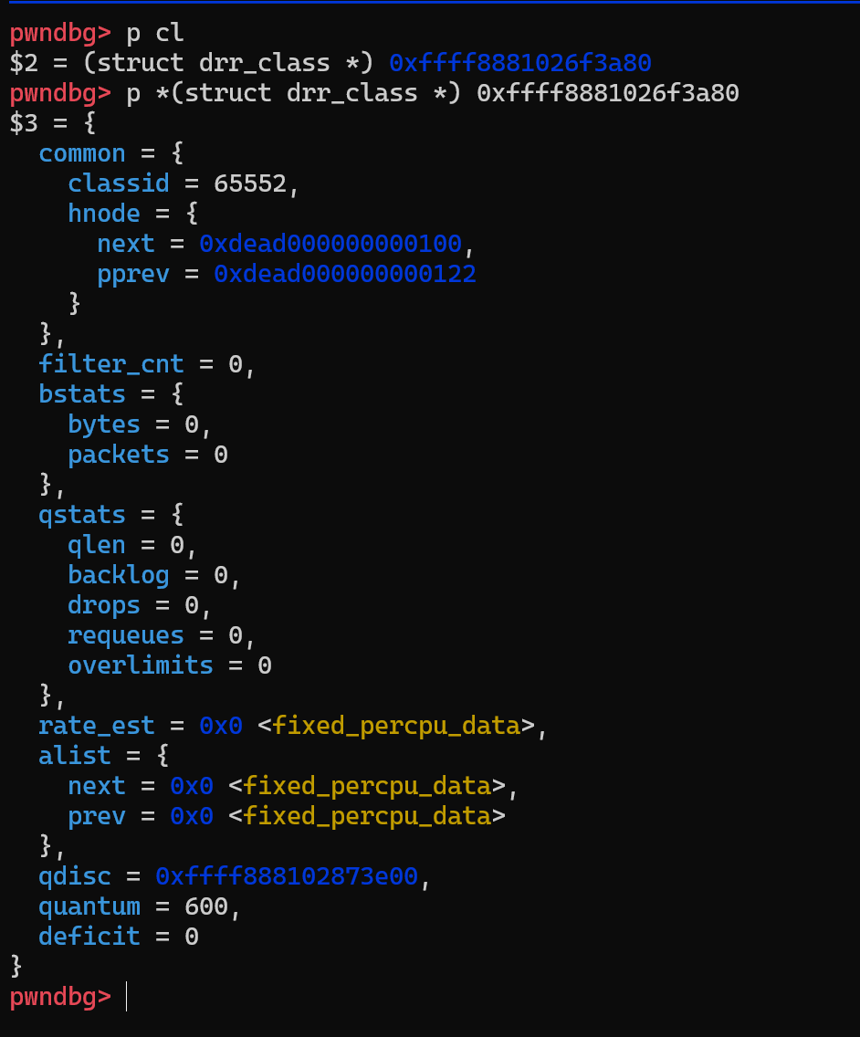 主要是在drr_destroy_class下断点,然后查看cl,在后续喷射完pg_vec(当然也可以使用其他结构体)之后,可依据需使用该命令查看是否覆盖成功: