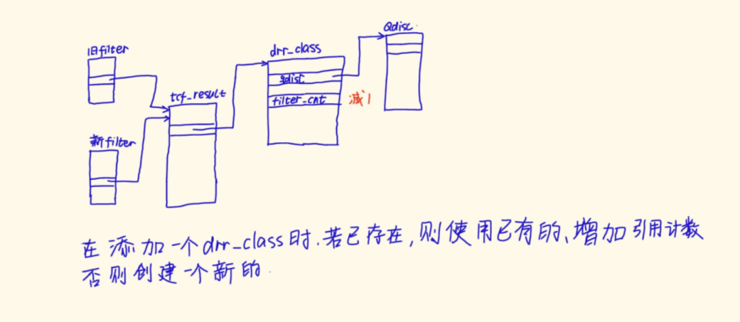 在这里将drr_class的filter_cnt减一;然而实际上,我们的class只是换了一个filter而已,其引用数不应该被减少;