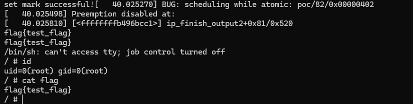 后边的攻击思路和CVE-2023-4207就一样了,提前喷射eBPF,是的在内核加载模块地址内部署好我们的代码片段,然后构造uaf,之后使用pg_vec喷射出来已经释放但是仍然被使用的drr_class,此时它的偏移0x60处的qdisc成员被填入了pg_vec申请的虚拟地址,虽然我们不知道这个地址,然后通过mmap可以映射这个地址,我们就有了写这个地址的权限,写其前8个字节为我们的目标地址,也就是我们喷射的eBPF地址,即可劫持控制流;然后实现地址泄露+覆盖core_pattern,最后在另一个进程触发crash,使得root1得到执行,提权成功!