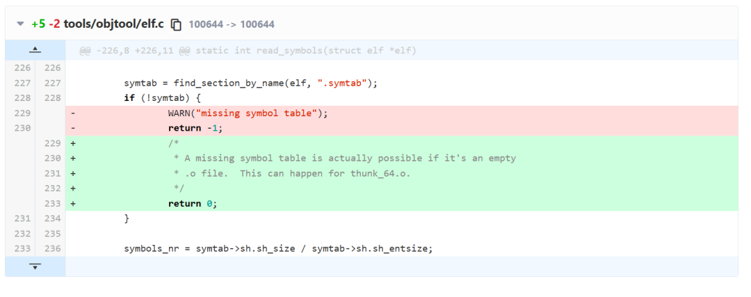 objtool: Don’t fail on missing symbol table · Pull Request !141 · openEuler/kernel(https://gitee.com/openeuler/kernel/pulls/141/files)