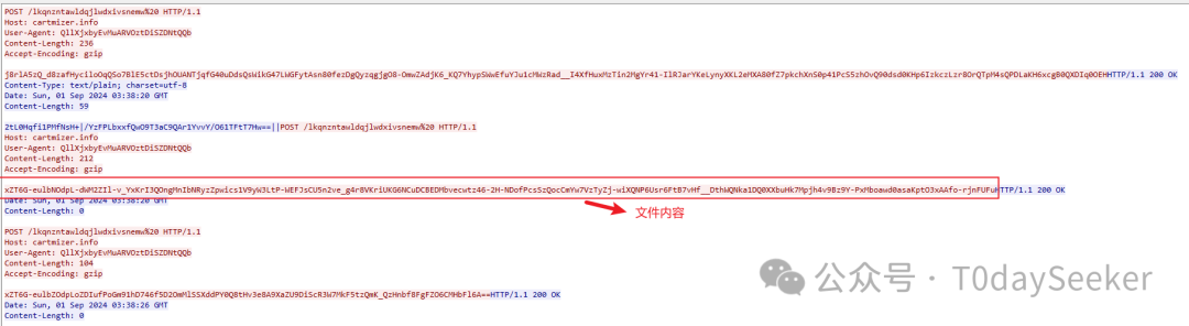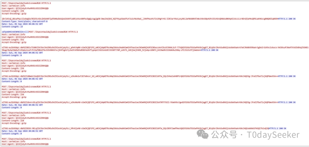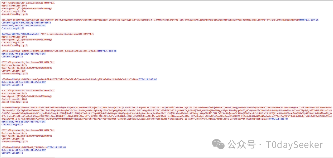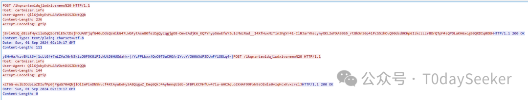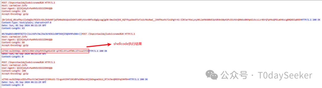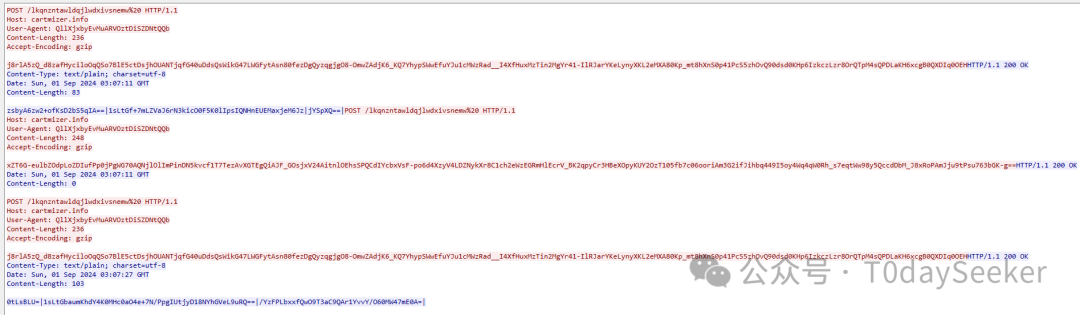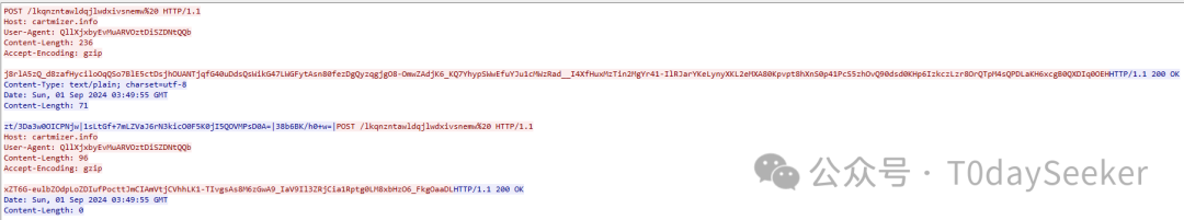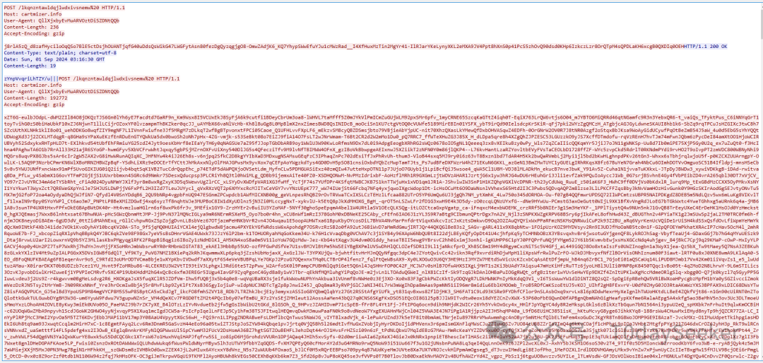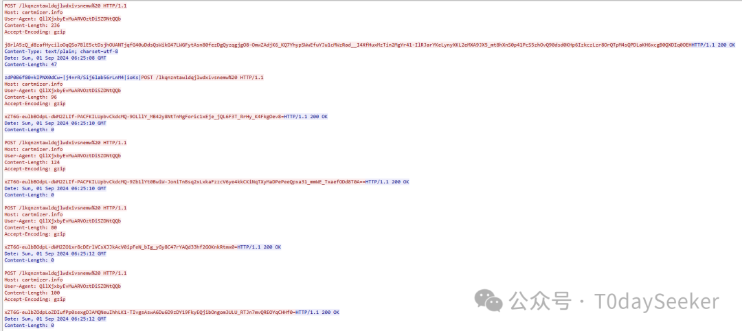 继续POST请求https://cartmizer.info/lkqnzntawldqjlwdxivsnemw地址,载荷中携带远控指令响应数据