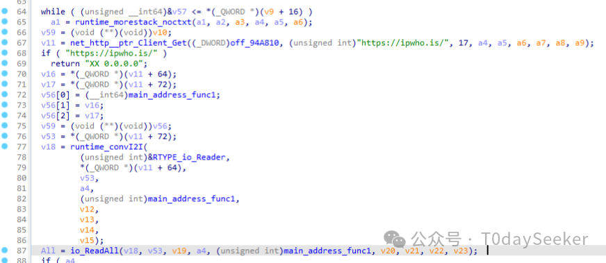 通过分析,发现样本运行后,将尝试外链https://ipwho.is/地址获取公网IP,提取country_code、ip字段作为POST请求载荷中的一部分。