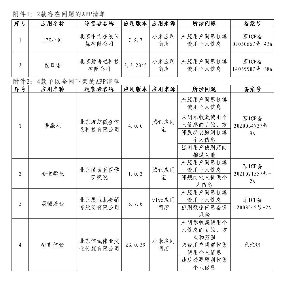 一、近期,北京市通信管理局通过抽测发现本市部分APP存在“违反必要原则收集个人信息”“未明示收集使用个人信息的目的、方式和范围”等侵害用户权益和安全隐患类问题。截至目前,尚有2款APP未整改或整改不到位,现予以公开通报(详见附件1)。