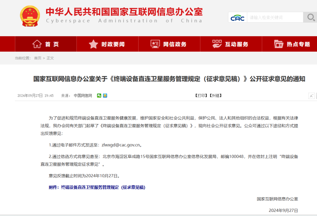 为了促进和规范终端设备直连卫星服务健康发展,维护国家安全和社会公共利益,保护公民、法人和其他组织的合法权益,根据有关法律法规,国家互联网信息办公室会同有关部门起草了《终端设备直连卫星服务管理规定(征求意见稿)》,现向社会公开征求意见。意见反馈截止时间为2024年10月27日。