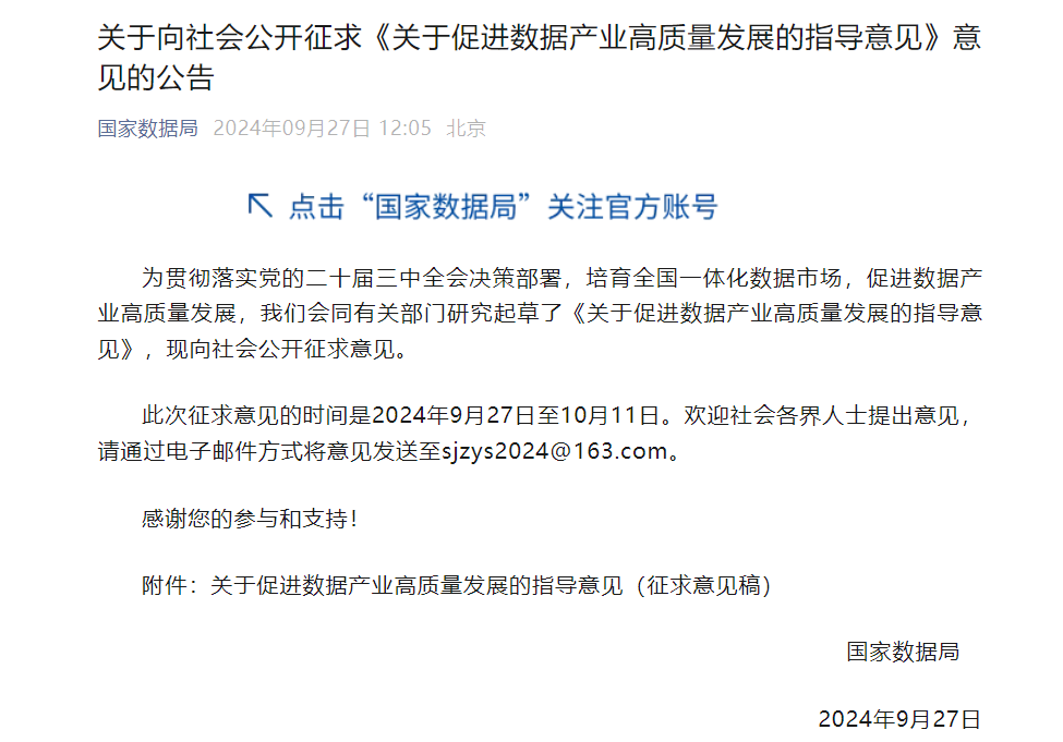 9月27日,国家数据局发布《关于向社会公开征求<关于促进数据产业高质量发展的指导意见>意见的公告》。