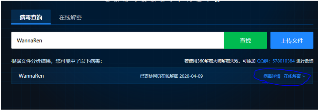 分别测试查询和解密的功能,发现系统会将上传后的文件带入内部病毒库去查询,然后对比md5值或者识别文件内容来判断病毒再响应出解密的方案给用户