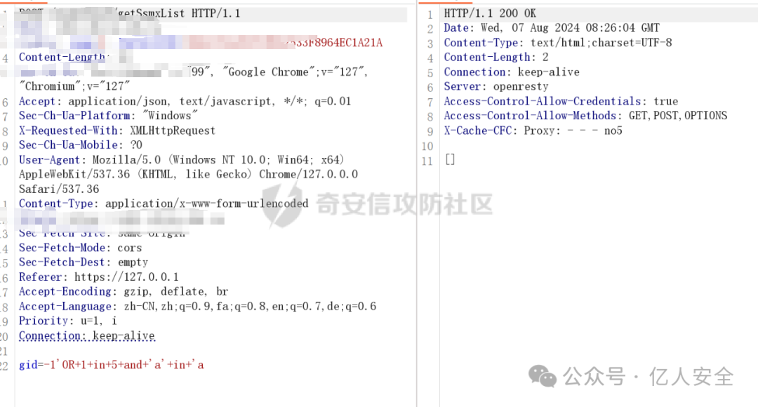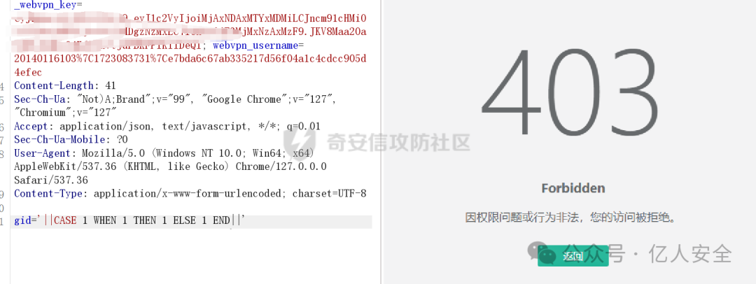 试了下orcale的注入方法,又爆403,这里’||55||’会返回空数据,’||1/0||’会爆500,这里判断语句能想到的都试了,全403,最奇怪的是只有语句正确才会403,少写一个D就会500,不知道这什么匹配逻辑,不过试了一些插入空白字符啥的也都不行