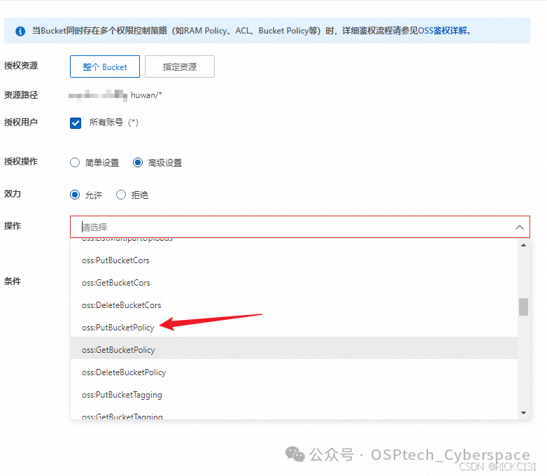 若拥有Bucket Policy 的编辑权限,可以通过上传或修改一个新的配置。涉及的权限如下图。
