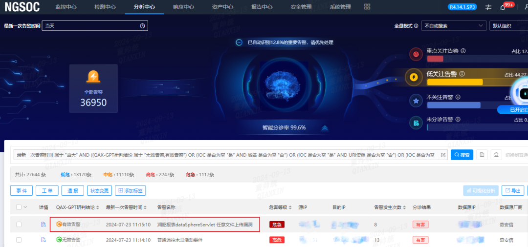通过“智能分诊”的初步降噪与QAX-GPT的二次确认,在一个NGSOC系统内有效地消除了90%的告警噪声。正是这种高效的“双重降噪”机制,使得小杨能够在攻击发生后的1分钟内,迅速捕捉到“润乾报表dataSphereServlet任意文件上传漏洞”这一紧急告警。