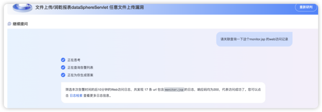 为了进一步确认攻击者上传的monitor.jsp文件是否真的成功,小杨在GPT对话框内输入了查询请求:“请关联查询这个monitor.jsp的web访问记录。”随即,GPT机器人自动触发了