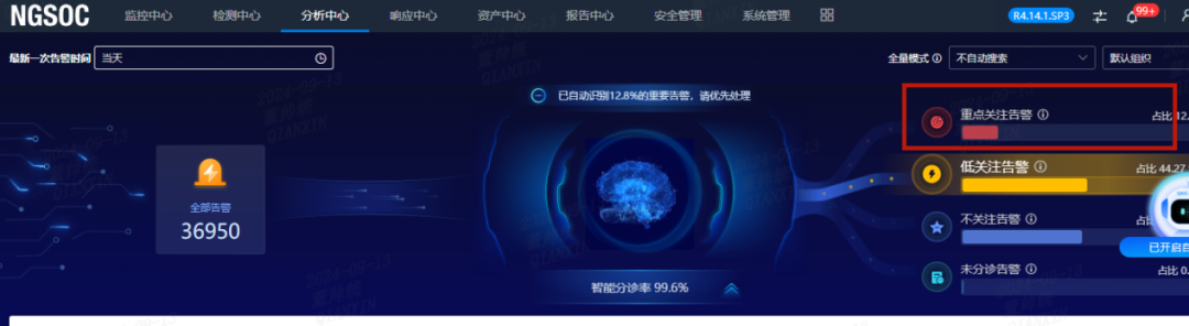 。在过去,从海量告警中筛选出重要信息需要多名同事分工协作,而现在,只需在NGSOC界面上一键点击“重点关注告警”按钮,小杨就能够迅速定位到那些