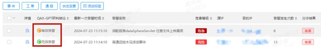。小杨在上述NGSOC“智能分诊”后的列表中点击“QAX-GPT研判状态”按钮,这些已被初步降噪的告警信息被QAX-GPT安全机器人再次过滤,准确地区分出攻击成功的“有效告警”和未攻击成功的“无效告警”。