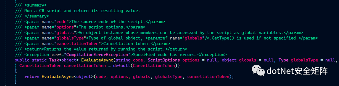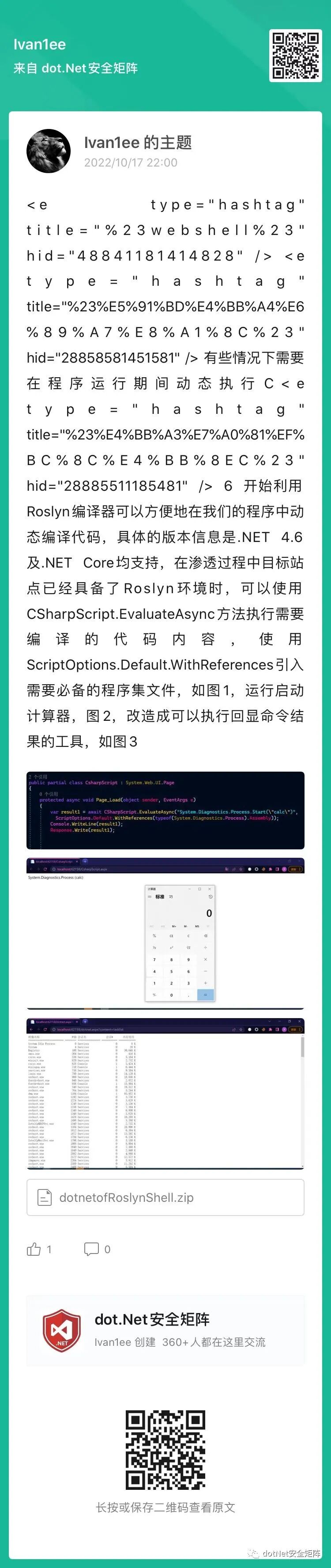 有些情况下需要在程序运行期间动态执行C#代码,从C# 6 开始利用Roslyn编译器可以方便地在我们的程序中动态编译代码,具体的版本信息是.NET 4.6及.NET Core均支持,假定在渗透过程中目标站点已经具备了Roslyn环境时,可以尝试使用CSharpScript.EvaluateAsync方法执行需要编译的代码内容,编译时需引入ScriptOptions.Default.WithReferences提供必备的程序集文件,执行后效果如图