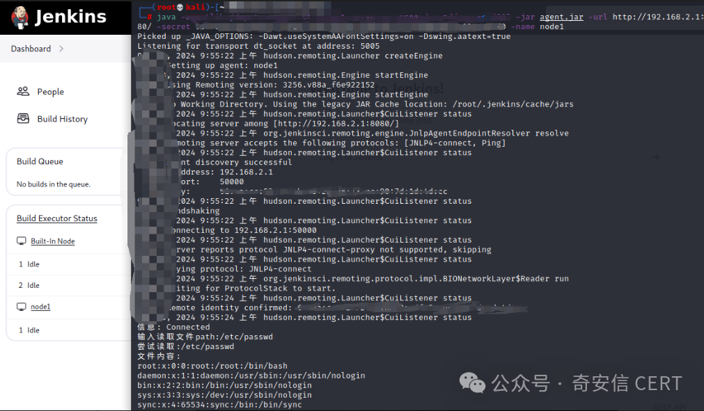 目前,奇安信威胁情报中心安全研究员已成功复现Jenkins Remoting 任意文件读取漏洞(CVE-2024-43044)****,截图如下: