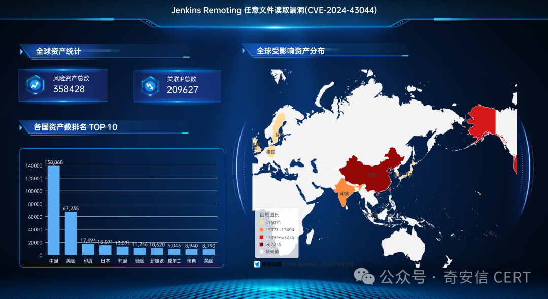 Jenkins Remoting任意文件读取漏洞(CVE-2024-43044)关联的国内风险资产总数为358428个,关联IP总数为209627个。全球风险资产分布情况如下: