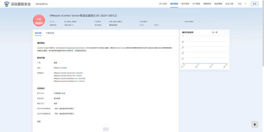 2024年9月19日,深瞳漏洞实验室监测到一则VMware-vCenter组件存在缓冲区溢出漏洞的信息,漏洞编号:CVE-2024-38812,漏洞威胁等级:严重。
