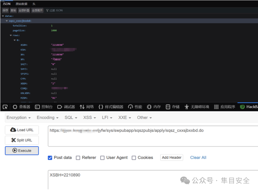 由于缺乏必要的权限验证,系统返回了对应学生的敏感信息。这表明系统存在水平越权漏洞,未能正确校验用户权限。