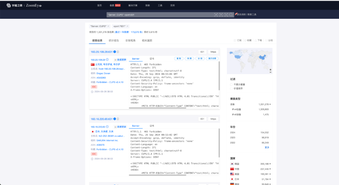 值得注意的是,该系列漏洞可通过互联网进行攻击,通过知道创宇旗下全球著名网络空间搜索引擎ZoomEye统计,曾经有大量(百万级)的系统对外开放了CUPS服务,近一年也有约18万资产对互联网开放了CUPS服务。