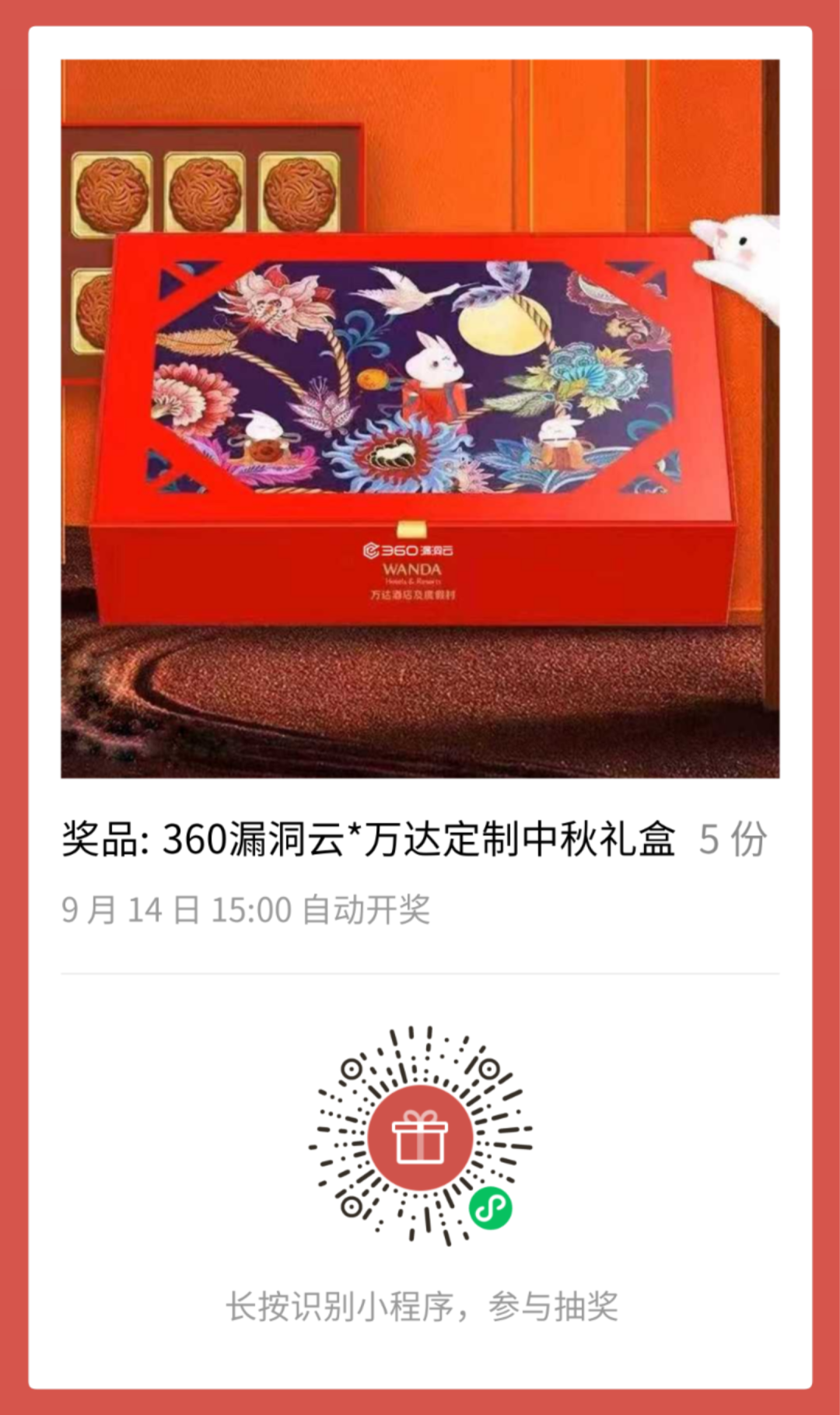提交有效漏洞的白帽子师傅,将获得我们精心准备的360漏洞云*万达专属中秋礼盒