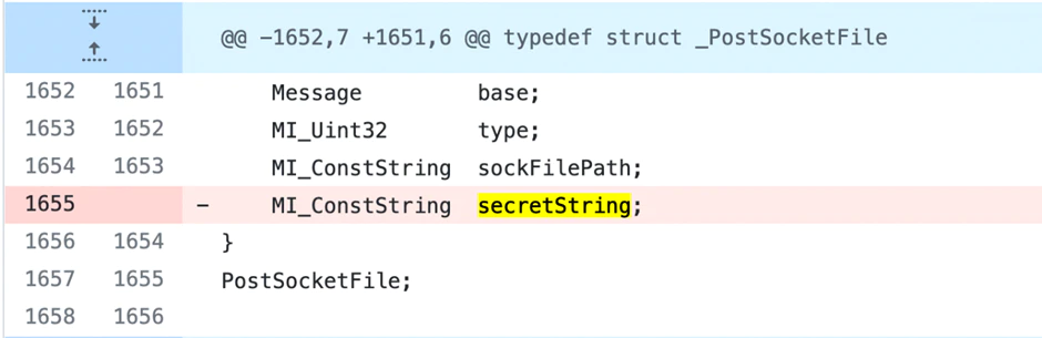 补丁,涉及多个文件的多个更改,这告诉我们修复此漏洞不是一项简单的任务。在审查这些更改时,我们观察到补丁包括OMI各个组件之间内部通信协议的重大设计更改。首先,开发人员删除了secretString机制,该机制以前用于验证一些最关键的内部通信——那么为什么OMI的开发人员决定取消它呢?