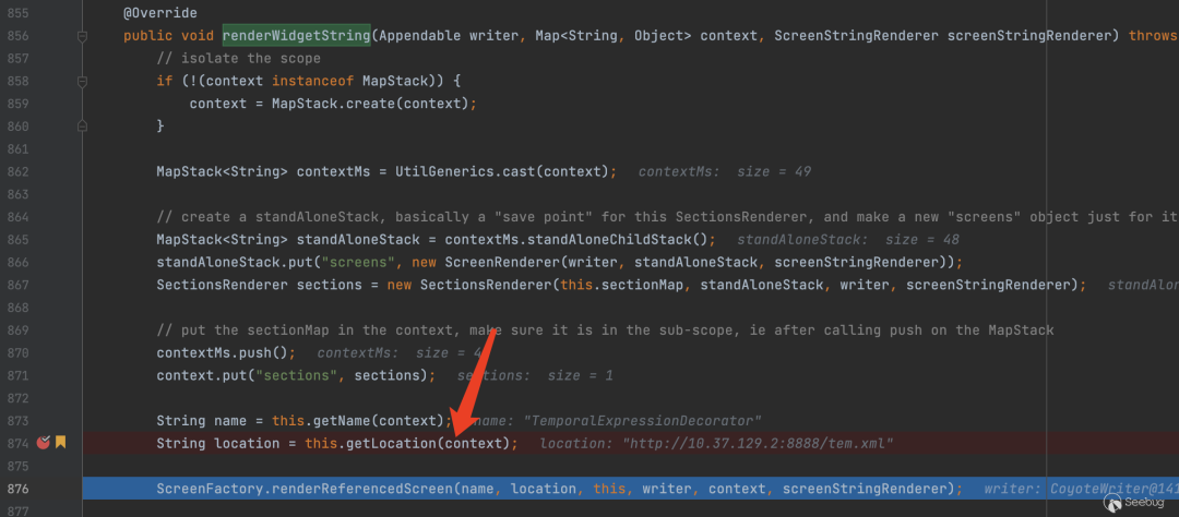 继续跟进到DecoratorScreen#renderWidgetString中调用this.getLocation方法解析模板获取parameters参数,如图9所示。